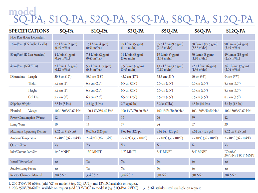 - Thiết bị khử trùng diệt khuẩn nước bằng đèn UV Viqua S5Q-PA2 có tuổi thọ cao, ổn định và dễ bảo trì. Đèn cực tím có thể được thay đổi mà không làm gián đoạn dòng nước . Đèn có hệ thống báo thời gian thay bóng và báo động khi có sự cố.